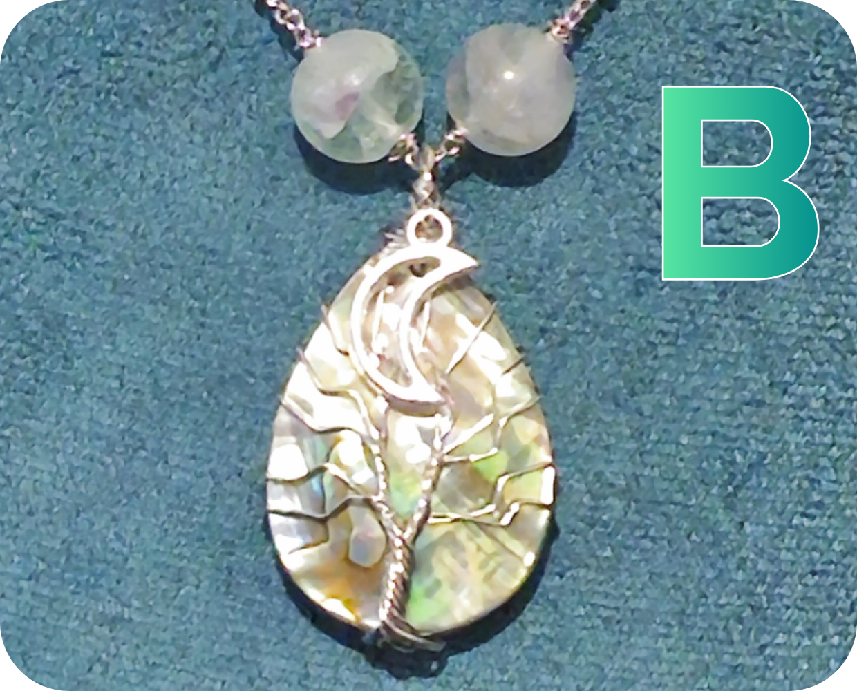 La nacre Abalone multicolore reflète créativité, joie et énergie positive. La fluorite favorise concentration, équilibre et protection. L’arbre de vie et le croissant de lune symbolisent la connexion à la nature et aux cycles cosmiques.